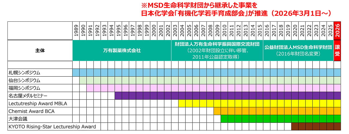 - 公益社団法人日本化学会が2026年3月1日付で公益財団法人MSD生命科学財団から受け継いだ 事業を推進するため、日本化学会「有機化学若手育成部会」が設立されました。日本化学会の確かな基盤のもと、歴史ある事業を継承し、持続的かつ発展的に運営していきます。