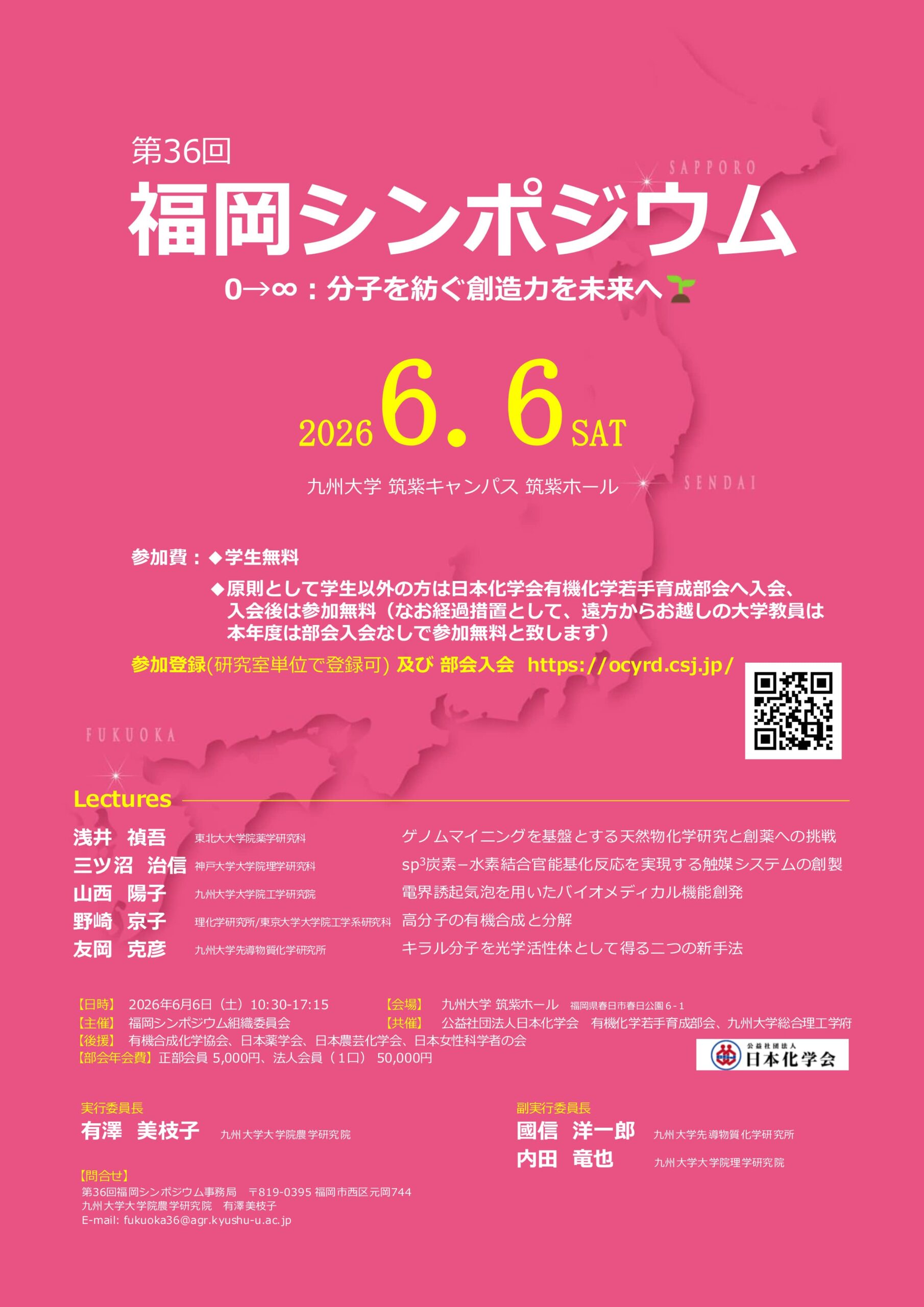 このたび、福岡シンポジウム組織委員会主催、日本化学会有機化学若手育成部会および九州大学大学院総合理工学府共催のもと、「福岡シンポジウム」を開催することとなりました。本年より「福岡万有シンポジウム」から「福岡シンポジウム」に名称を改め、運営体制を変えて新たな一歩を踏み出しました。まずは、本シンポジウムの趣旨にご賛同いただき、多大なるご支援を賜りました九州・山口地区各大学および協賛企業の皆様に、心より厚く御礼申し上げます。本シンポジウムは、皆様のご支援によって支えられております。本年は九州大学筑紫キャンパスにて開催いたします。